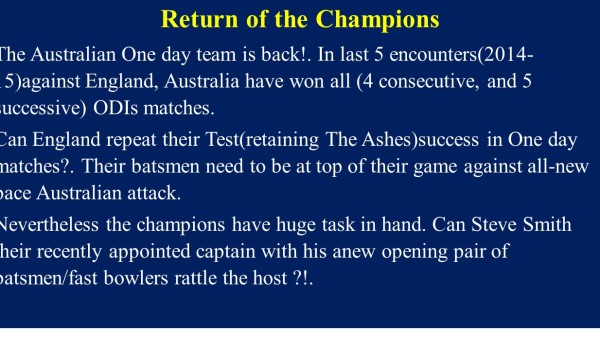 The Australian One-day team is back!. It took 12 games for England’s new captain Eoin Morgan to win his first series win, a culture they would like to … Continue reading