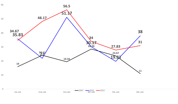 At end of 27th game – Average score batting first is 166 – a drop by 4 runs since end of 20th game. An overall drop of 2 points in batting average in same period, now the batting average is … Continue reading